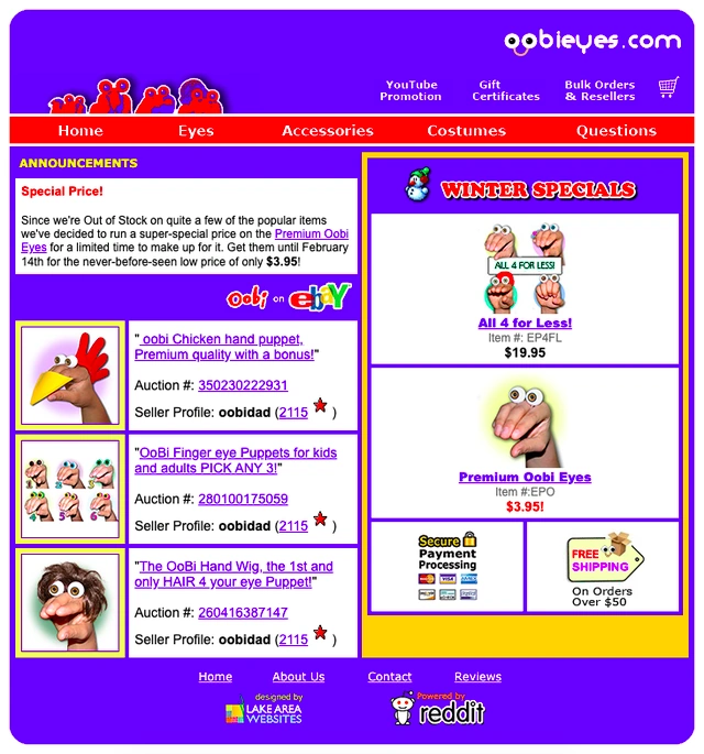 Oobi Eyes and other Noggin merchandise Noggin gave out toy versions of the Oobi puppet eyes at two events: Club Noggin and Oobi Arts and Crafts. Club Noggin was held at malls across America from 2004 to 2006. Each month, it featured a different character as the theme, one of them being Oobi. The Arts and Crafts session was held in 2007 at the Nick Hotel in Orlando. Attendees could watch a screening of "Make Art!" and pick up a pair of official Oobi Eyes. (source) Official eyes[]The official replicas were only given out at Club Noggin and the Nick Hotel. These eyes were posable, and they had peach-colored bands/rings that could be bent to fit on any finger. OobiEyes.com[] The homepage for OobiEyes.com In 2006, an unofficial website called OobiEyes.com started selling its own replicas of Oobi Eyes. It was completely operated by fans, with no connection to Noggin. It mainly sold "premium" eyes that were exact likenesses of Oobi, Uma, and Kako. It also sold costumes, wigs, and off-brand googly eyes. This site was very popular with fans of the show. In 2008, it launched an advertising campaign with YouTube that inspired a lot of fan-made videos with Oobi Eyes. (source) The website closed in 2013 after supplies ran out. As of now, the eye puppets from OobiEyes.com still pop up on eBay from time to time. Although it was unofficial, the site was recognized by Nick Jr. on its Facebook page, and Nickelodeon Pakistan featured a photo from OobiEyes.com on its website. Links[] |